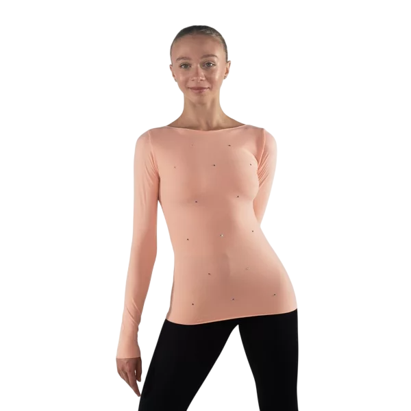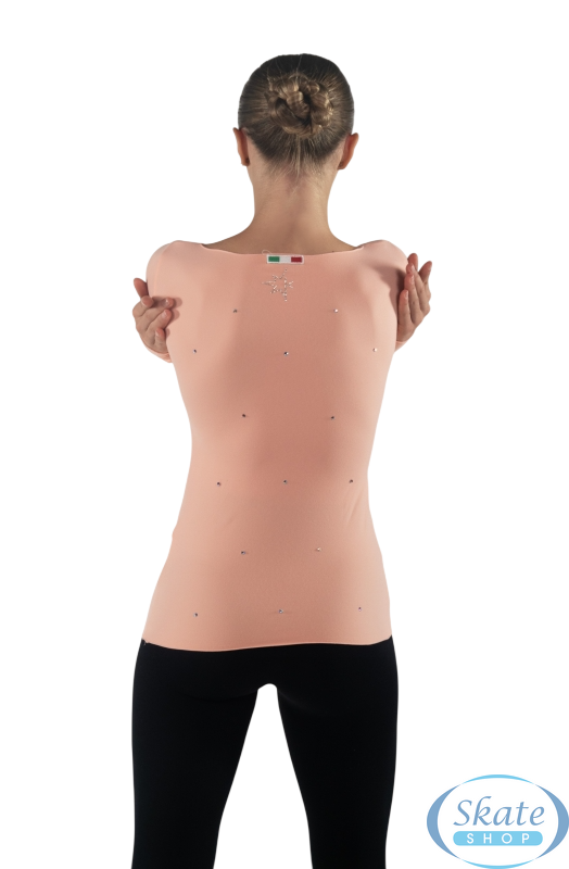 Book an appointment for skate fitting »Karisma Morfeo shirt made from soft Colorado fabric. Features a rhinestone pattern and a boat neckline.